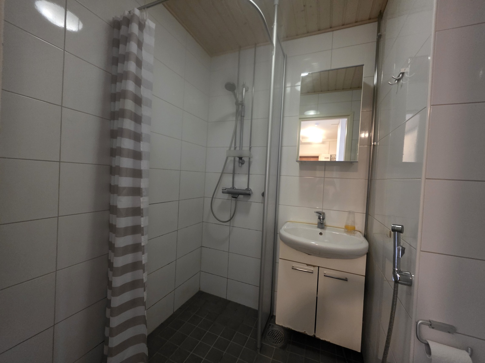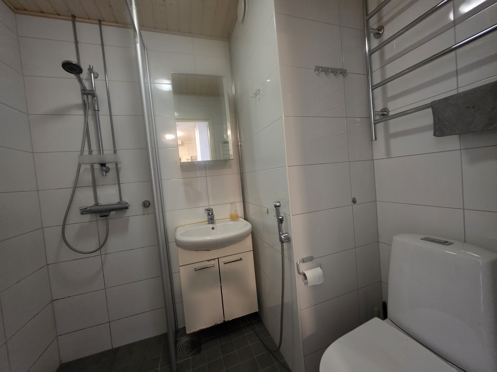 Varusteet: wc-istuin,suihku,peilikaappi,kiinteät valaisimet