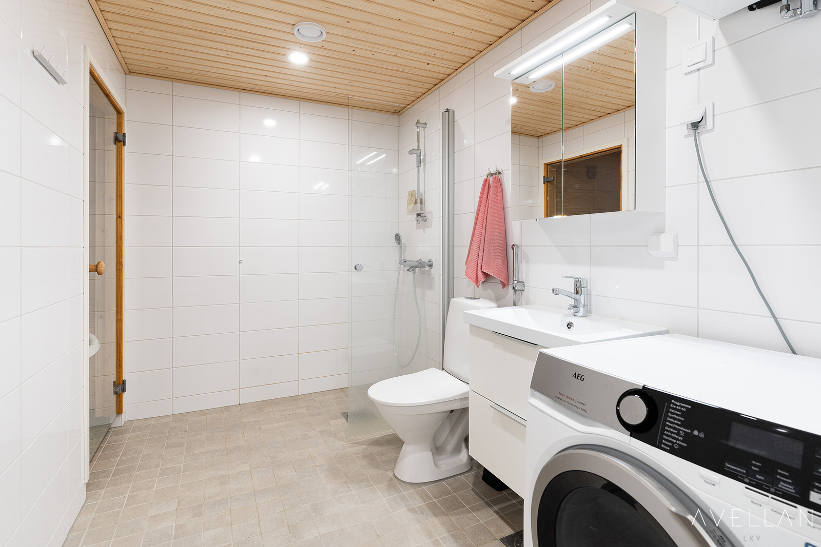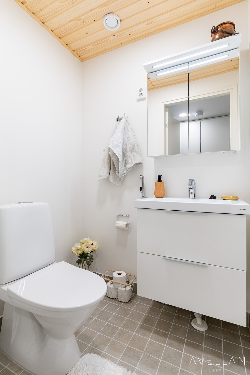 Varusteet: suihkuseinä,pesukoneliitäntä,lattialämmitys,wc-istuin,suihku,peilikaappi