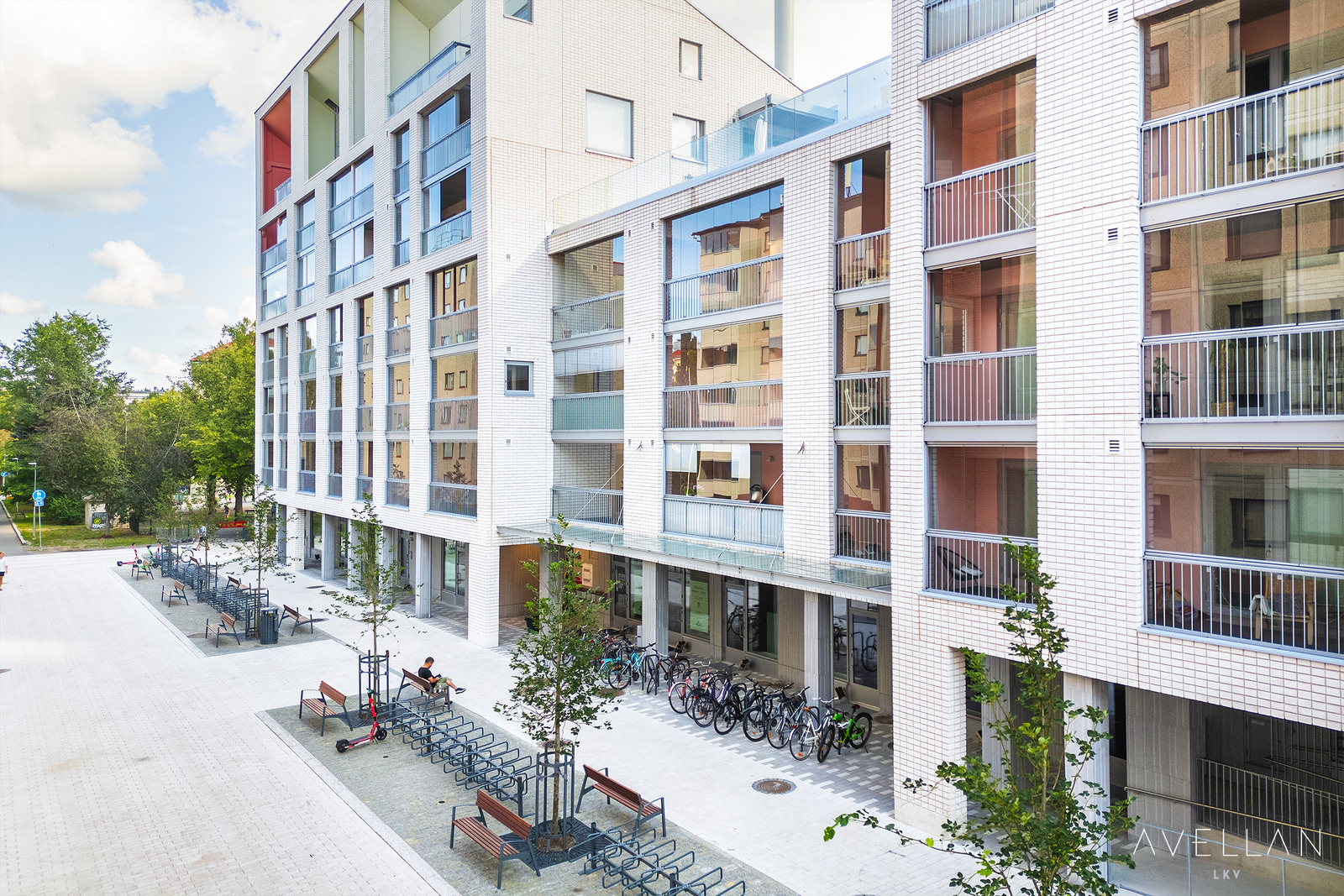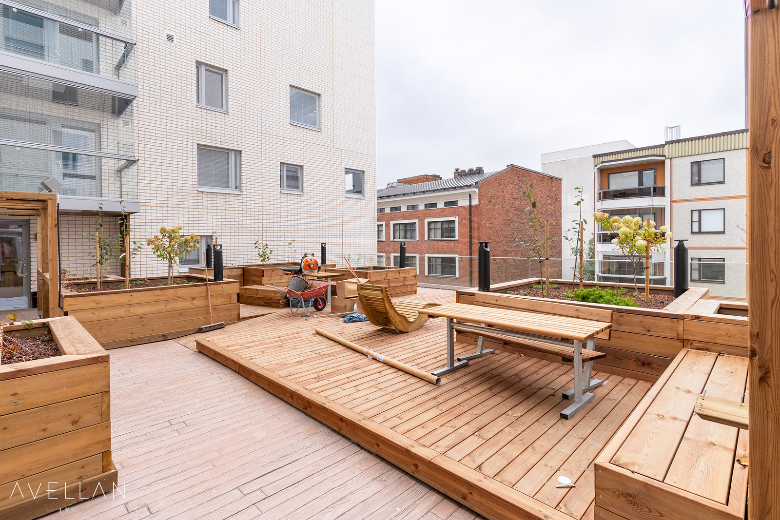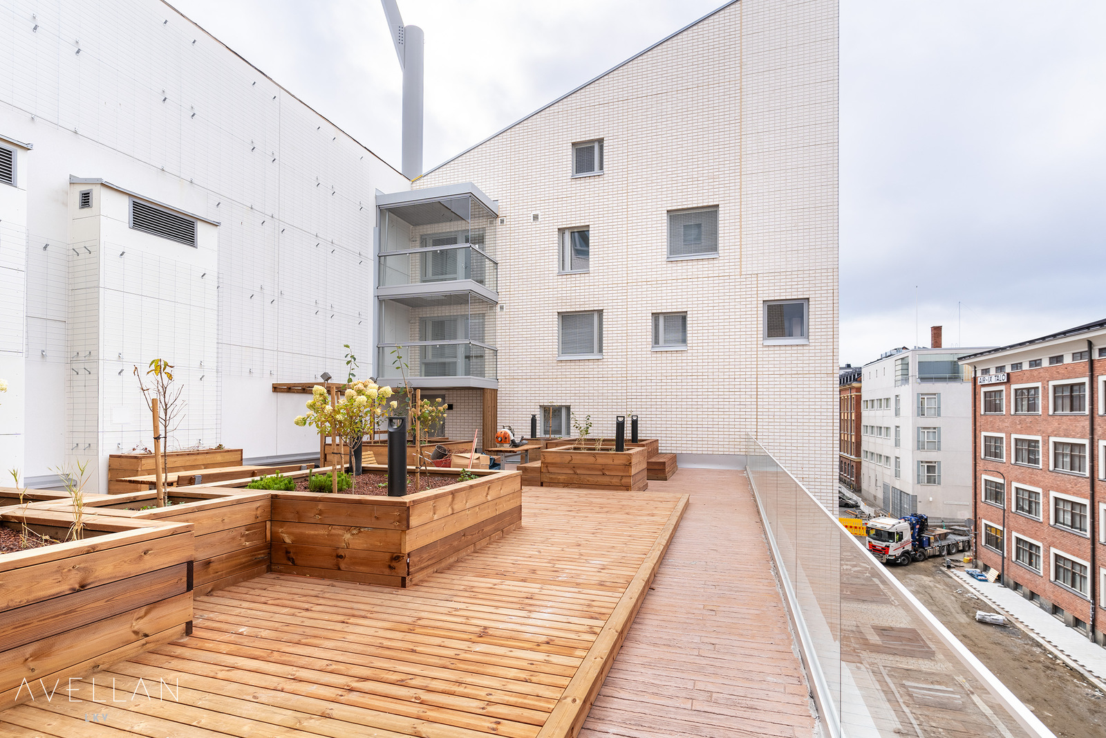 Taloyhtiön kaksi yhteisterassia matalampien kattojen päällä, ottavat mallia uniikista New Yorkin High Line -puistoalueesta. Terassit istutuksineen ja aurinkotuoleineen ovat paitsi näyttäviä myös viihtyisiä.