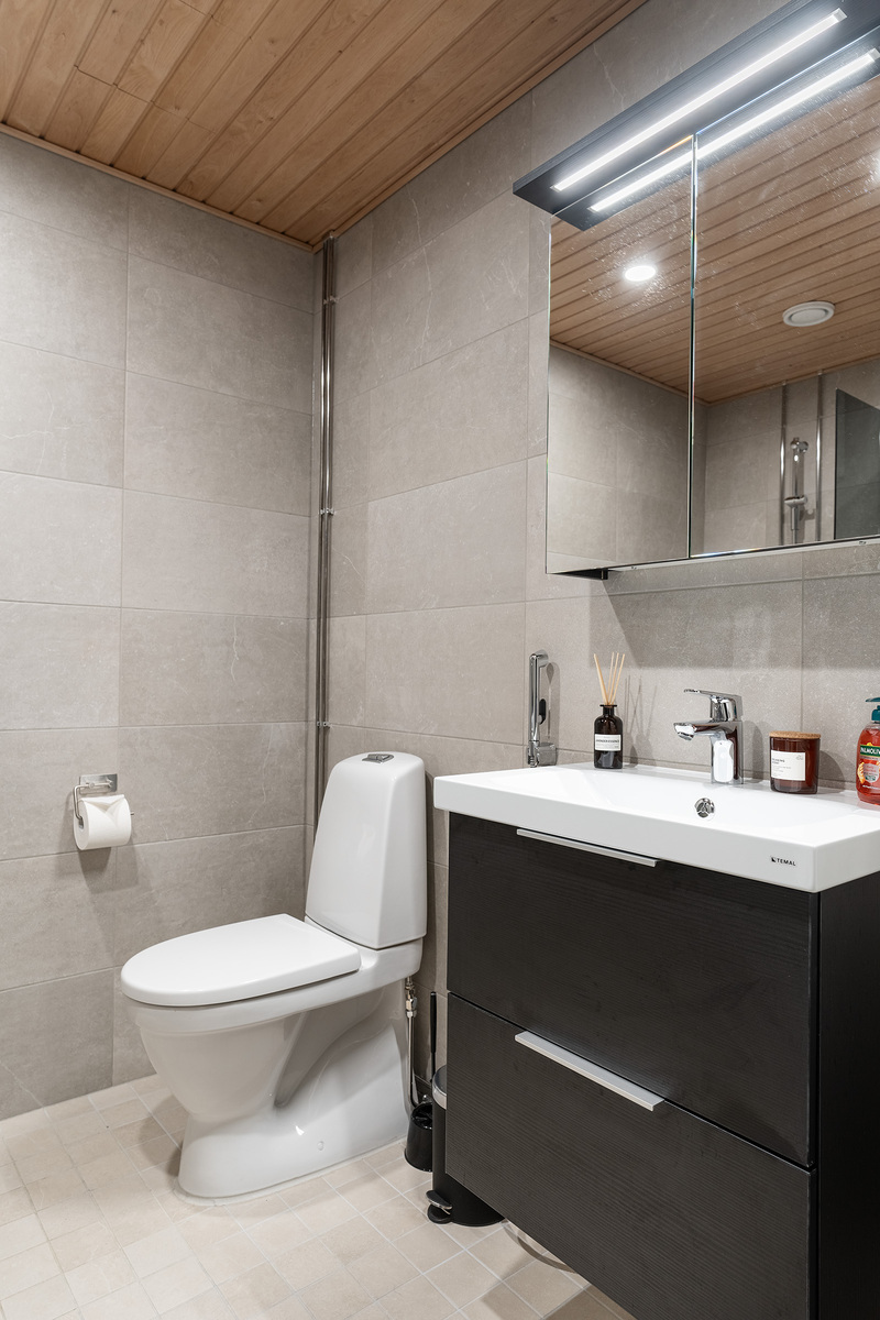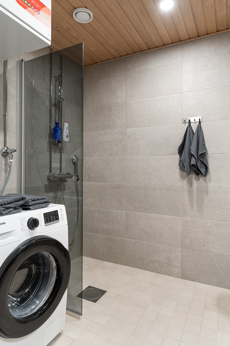 Varusteet: suihkuseinä,pesukoneliitäntä,lattialämmitys,wc-istuin,suihku,peilikaappi