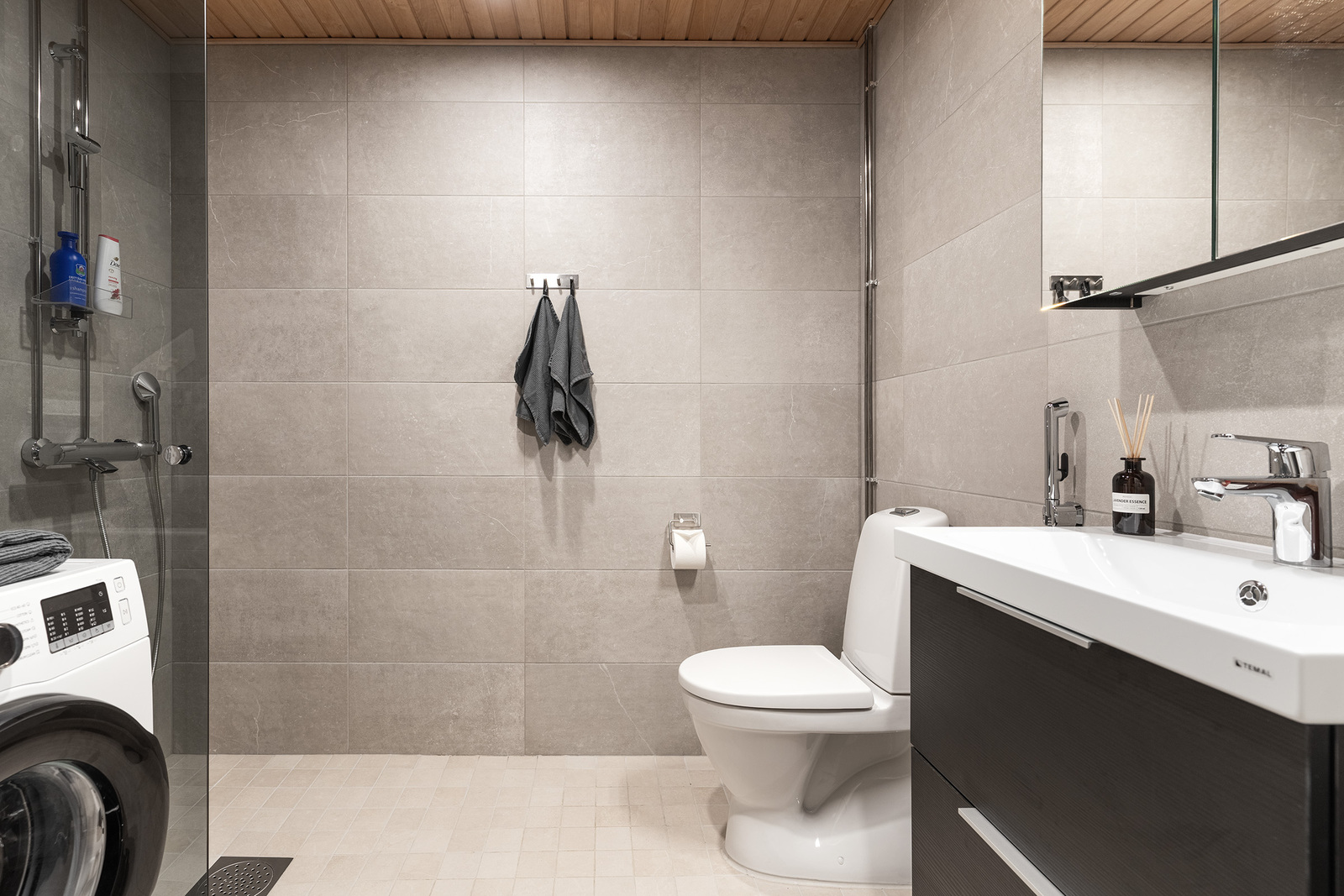 Seinät on laatoitettu Oyster 30x60 laatalla, lattiat Sand 10x10. Suihkussa on harmaa suihkuseinä. Allaskaappi ja peilikaappi ovat mustat.