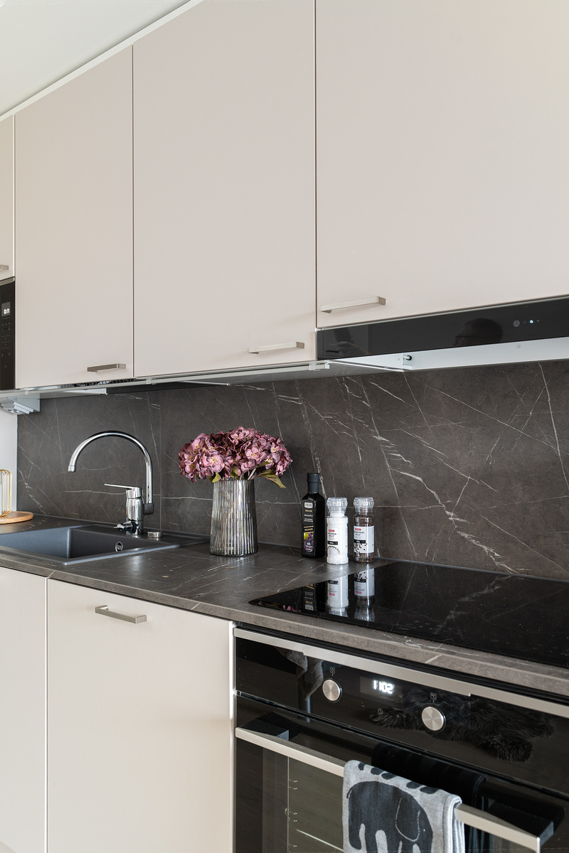 Keittiön kaapit ovat matta kashmir MDF ovea ja välitilassa sekä työtasona laminaatti taso, väriltään harmaa marmorikuvio. Jääkaappi/pakastin on rosterin värinen ja astianpesukone on integroitu. Lattia on kovapuulattia väriltään coconut cream 2-säleinen.
