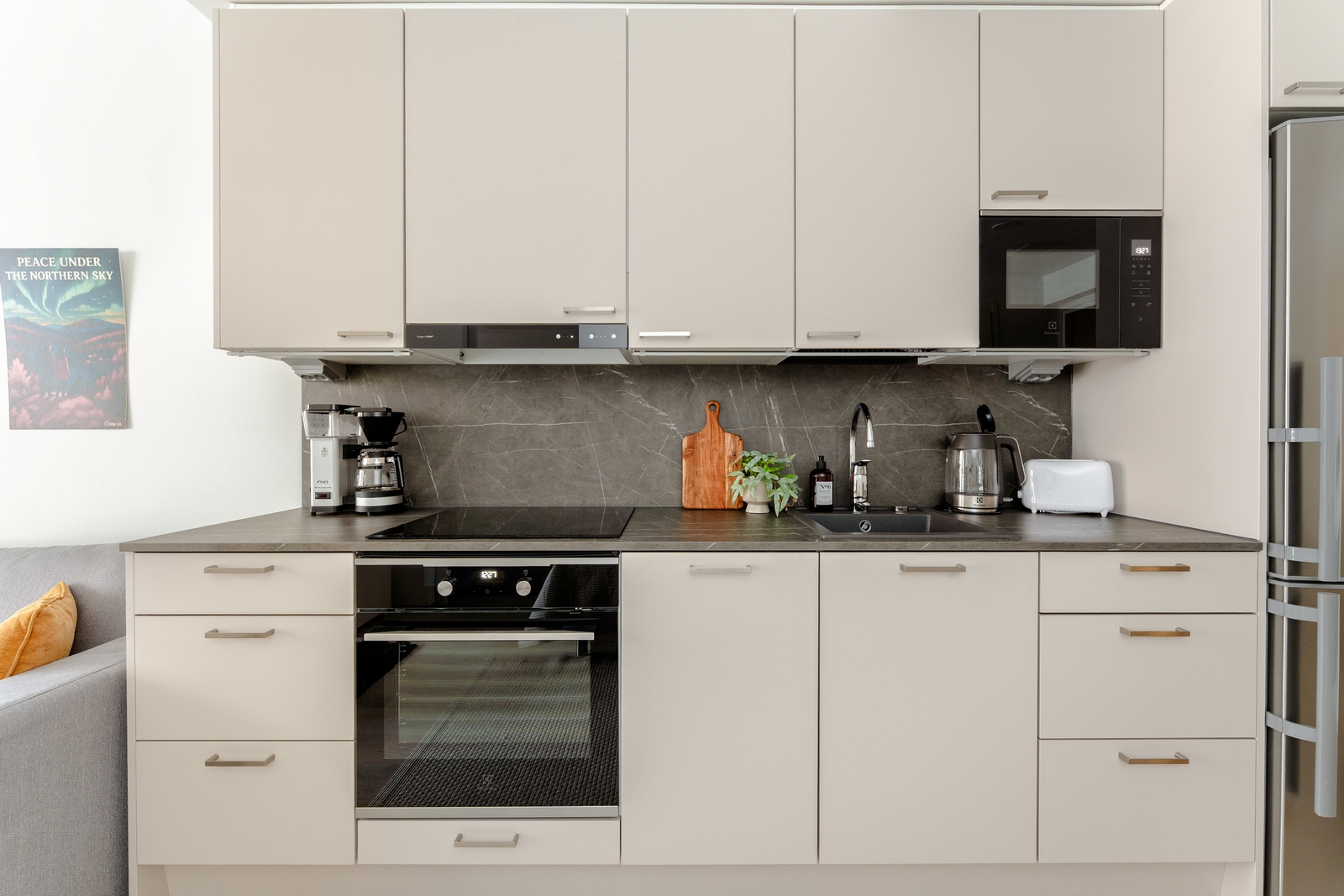 Keittiön kaapit ovat matta kashmir MDF ovea ja välitilassa sekä työtasona laminaatti taso, väriltään harmaa marmorikuvio. Jääkaappi/pakastin on rosterin värinen ja astianpesukone on integroitu. Lattia on kovapuulattia väriltään coconut cream 2-säleinen.