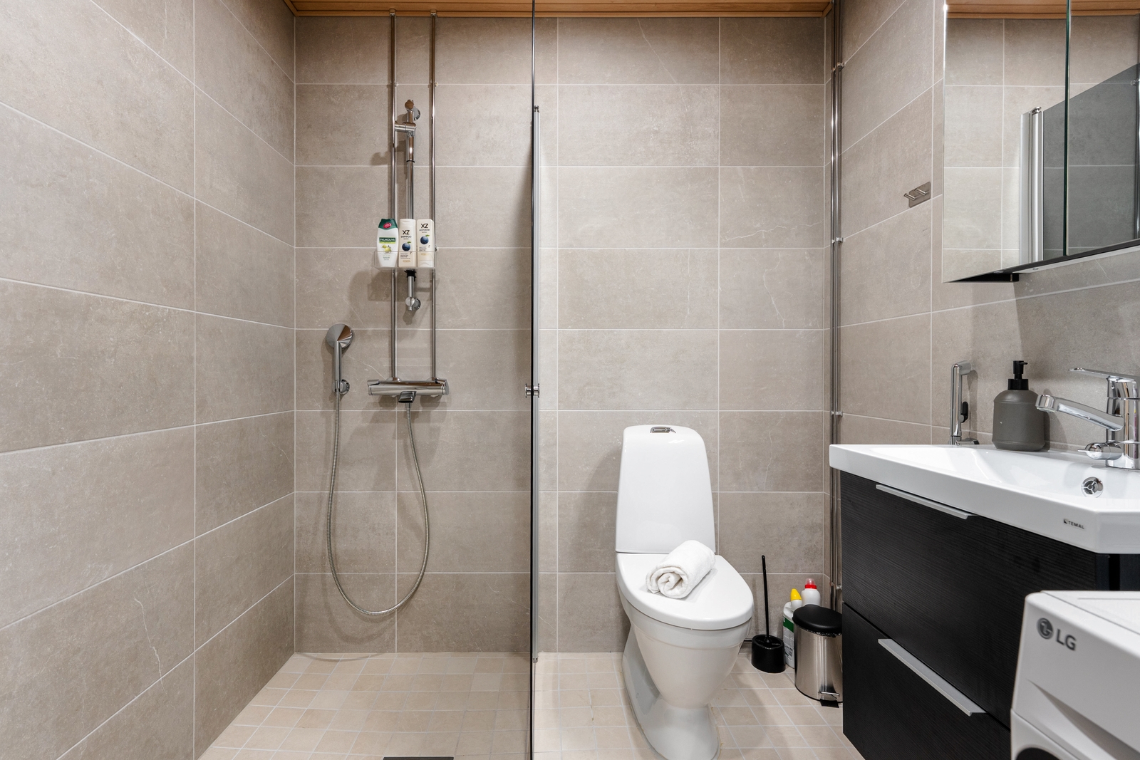Seinät on laatoitettu Oyster 30x60 laatalla, lattiat Sand 10x10. Suihkussa on harmaa suihkuseinä. Allaskaappi ja peilikaappi ovat mustat.
