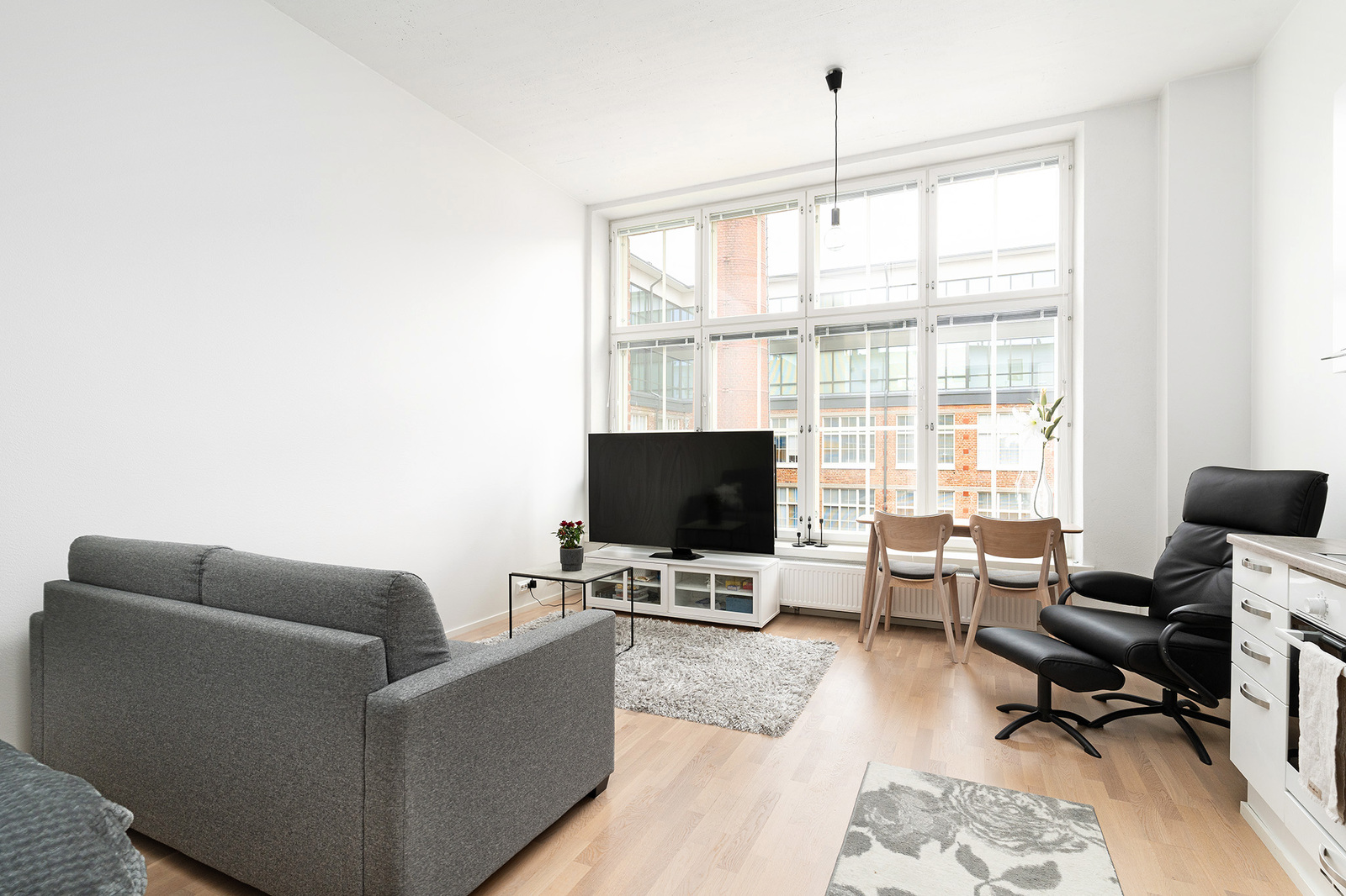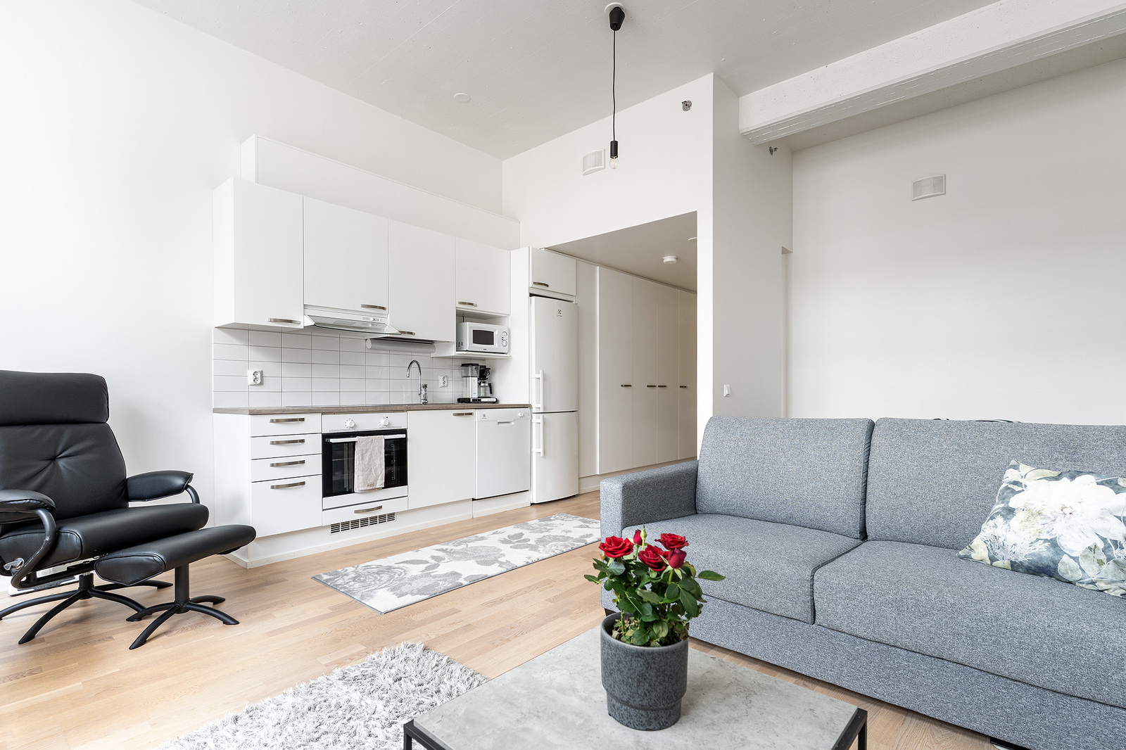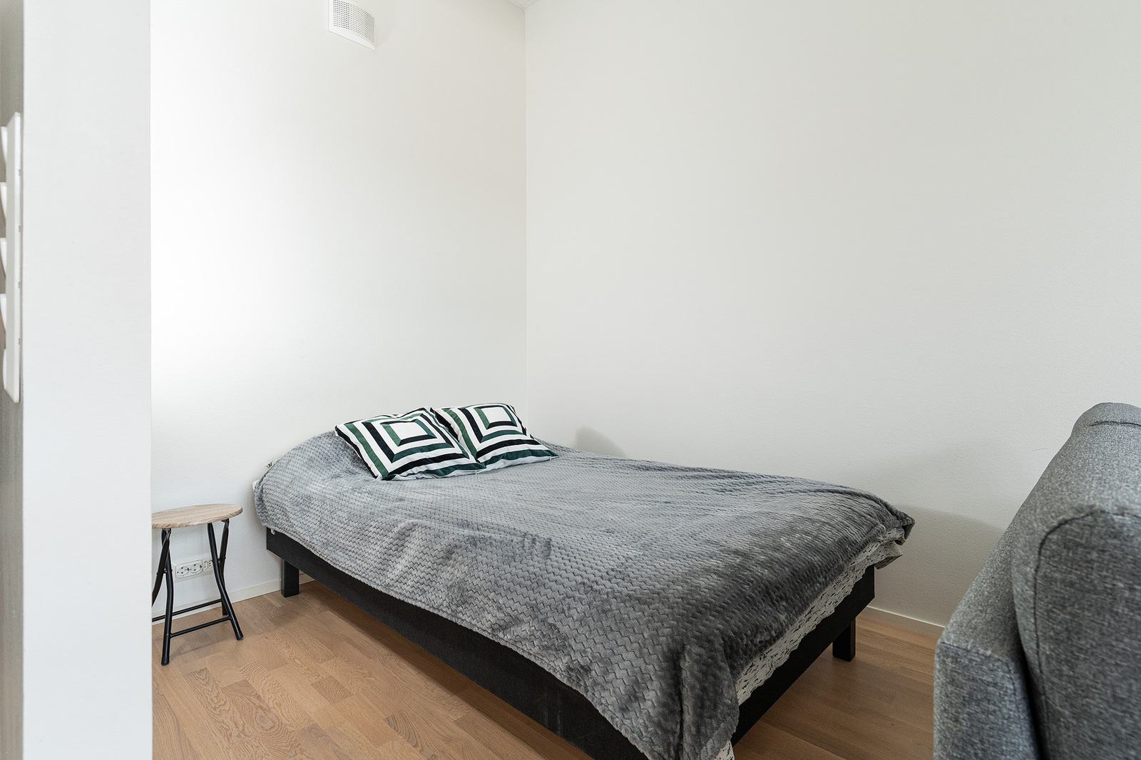 Seinät maalattu, lattia parkettia. Olohuoneessa kiva alkovi sängylle.