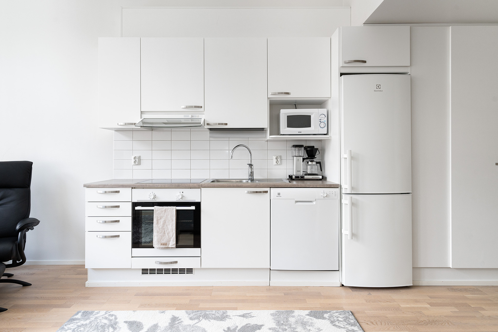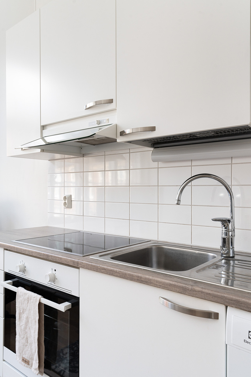 Keittiössä valkoiset kaapinovet ja laminaatti työtaso.
